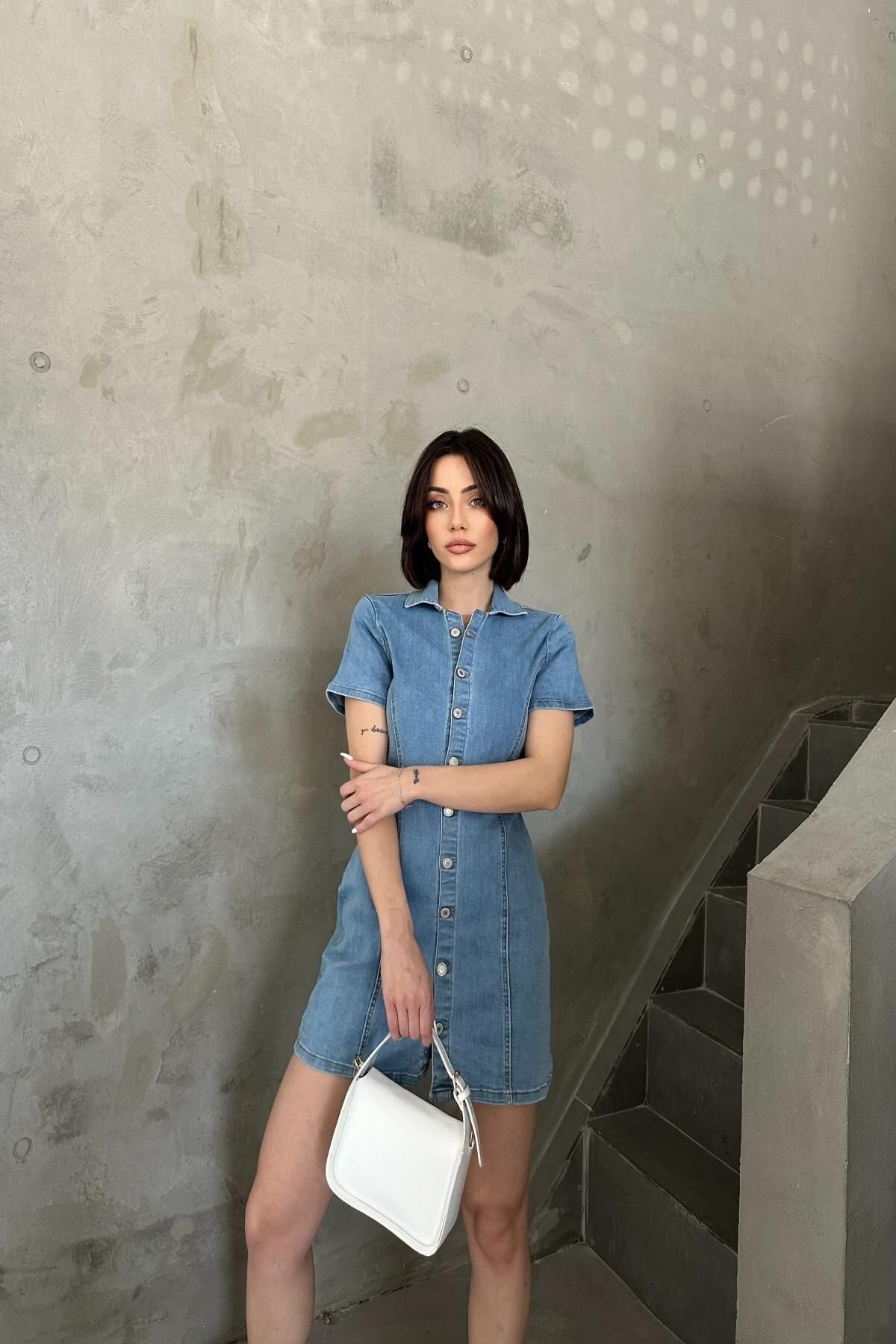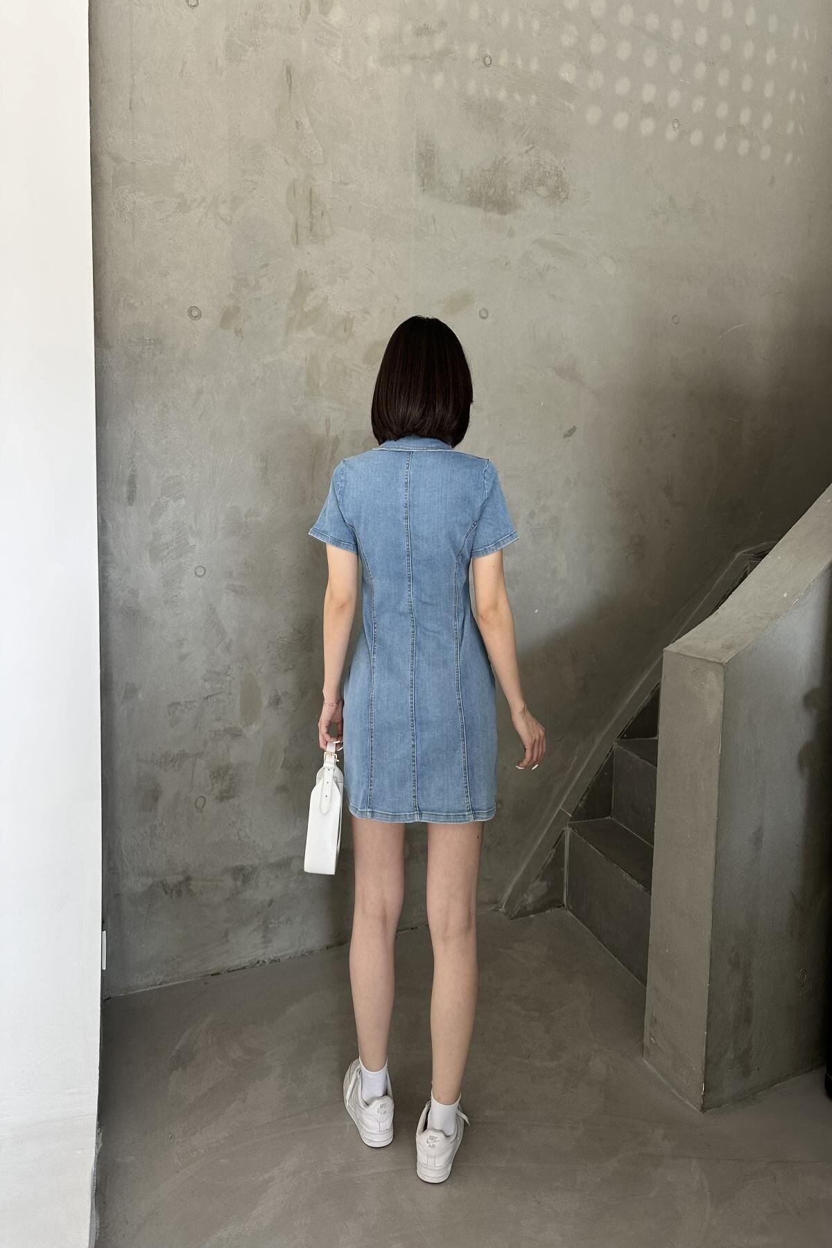 Kadın Düğmeli Esnek Polo Yaka Kot Mavi Mini Elbise