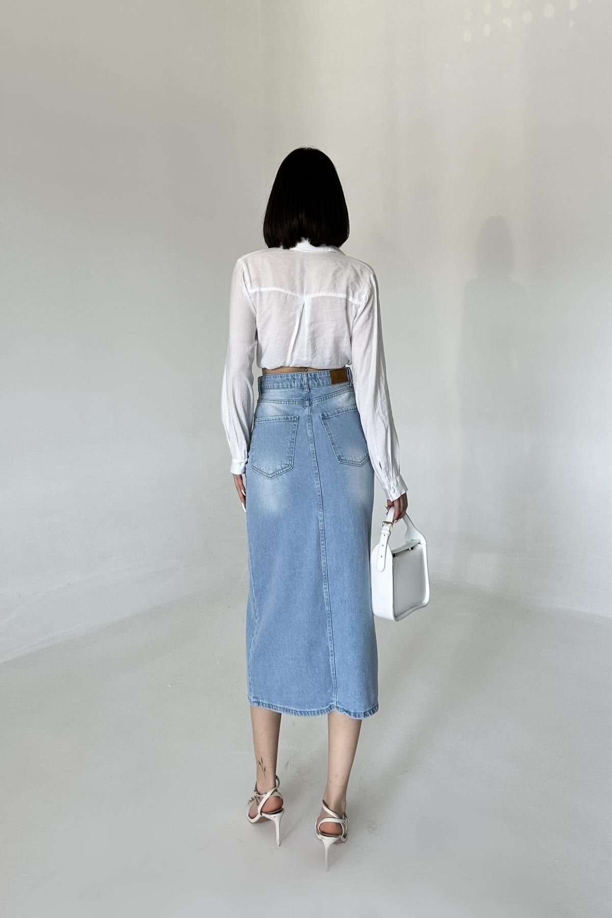 Kadın Pamuklu JeansVibe Düğme Detaylı Uzun Açık Mavi Kot Etek