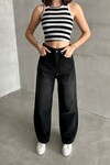 Kadın Jeans Çantalı Bol Paça Mom Fit Siyah Kot Pantolon