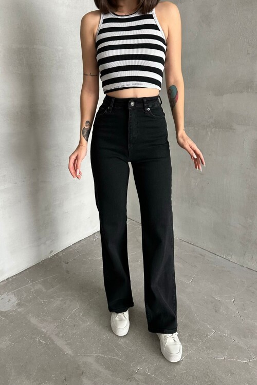 Kadın Jeans Yüksek Bel Esnek Bol İspanyol Paça Siyah Kot Pantolon