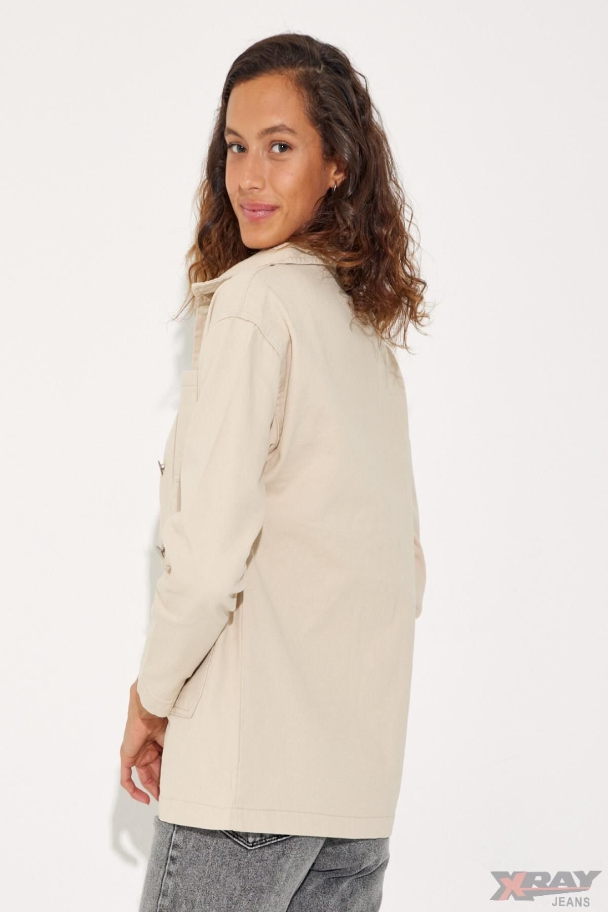 Kadın Uzun Tesettür Polo Yaka Düğmeli Cepli Krem Kot Ceket